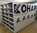 Основу конструкции мобильных стеллажей составляет разборное движущееся основание (база) с рельсовой системой, каркас, привод передвижения. Привод механический от штурвала, с автоматическим компенсатором ослабления натяжения цепи и стопорным механизмом. Трехлучевой пластиковый штурвал с вращающимися эргономичными рукоятками. Детали каркаса – сплошные стойки, полки, крестовины.