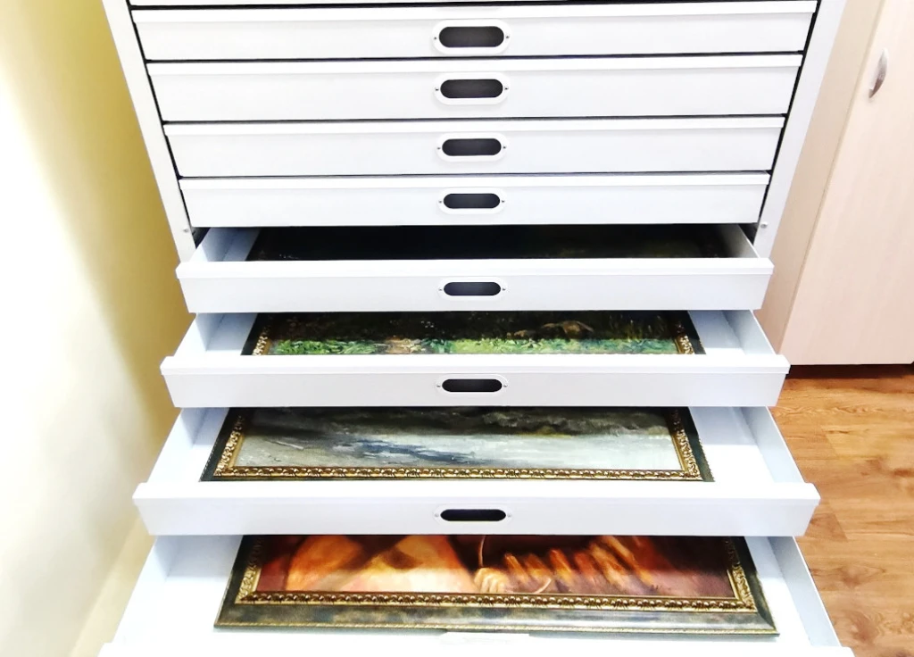 Для хранения натюрмортного фонда, репродукций, альбомов, холстов используются стеллажи с ячейками или выдвижными ящиками. При необходимости, для защиты хранимых материалов от постороннего доступа, от прямых солнечных лучей и пыли на стеллаже для картин устанавливаются двери, замки.