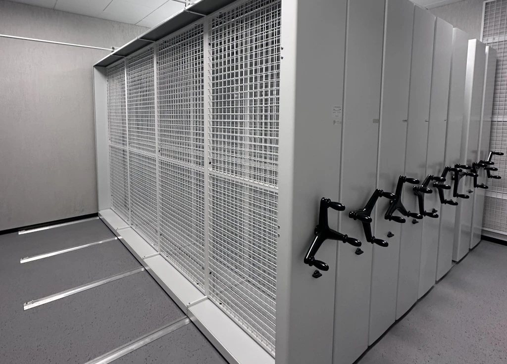 Раздвижные стеллажи с сетками - это удобная система хранения картин в фондохранилище музея, которая позволяет защитить их от пыли, грязи и повреждений и сэкономить площади.