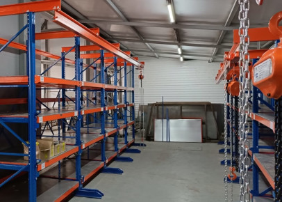 Тельфер на монорельсе прекрасно справляется с работой по подъему тяжёлых грузов. Но при его использовании в цеху имеются зоны, которые тельфер не может обслуживать. Поэтому на участке хранения тяжелой оснастки Заказчик установил несколько линеек стеллажей Slide со встроенной талью.